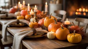 When the weather cools, the mood on your table should shift too. Richer tones—deep reds, burnt oranges, mustard yellows—create warmth, and layering different textures brings comfort. Velvet or knitted napkins, for example, might sound like a hassle but they do set a cozy tone.