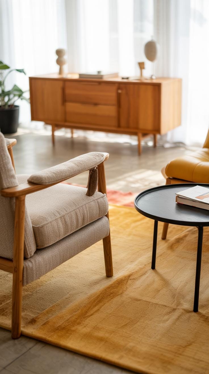 Choose rugs that complement the color palette. A neutral or lightly patterned wool rug anchors the room and softens hard floors. This creates a cozy spot for gathering or relaxing.
