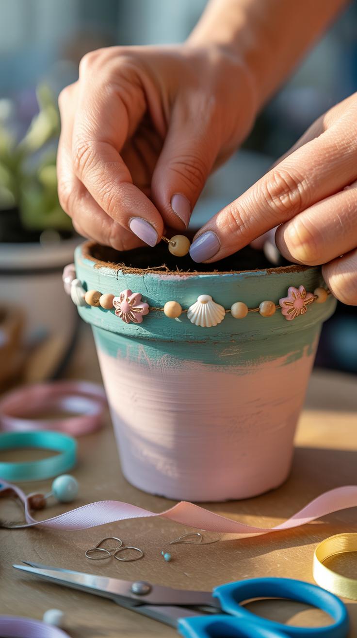 Glue can be a little tricky because not all adhesives hold up outdoors. I’ve had luck with waterproof craft glues—these usually keep decorations attached even if the pot gets rained on. For decorations, small stones, shells, or even sturdy ribbons can add visual interest without fading too fast.