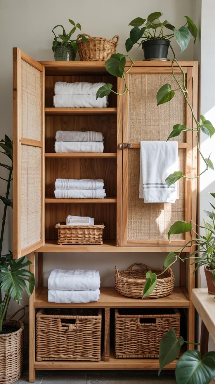 Bamboo blinds soften natural light without blocking it, creating soothing shadows throughout the day. These blinds also regulate temperature, helping your bathroom feel fresh and cool. Rattan baskets serve as both storage and decoration, adding woven patterns that break up smooth surfaces.