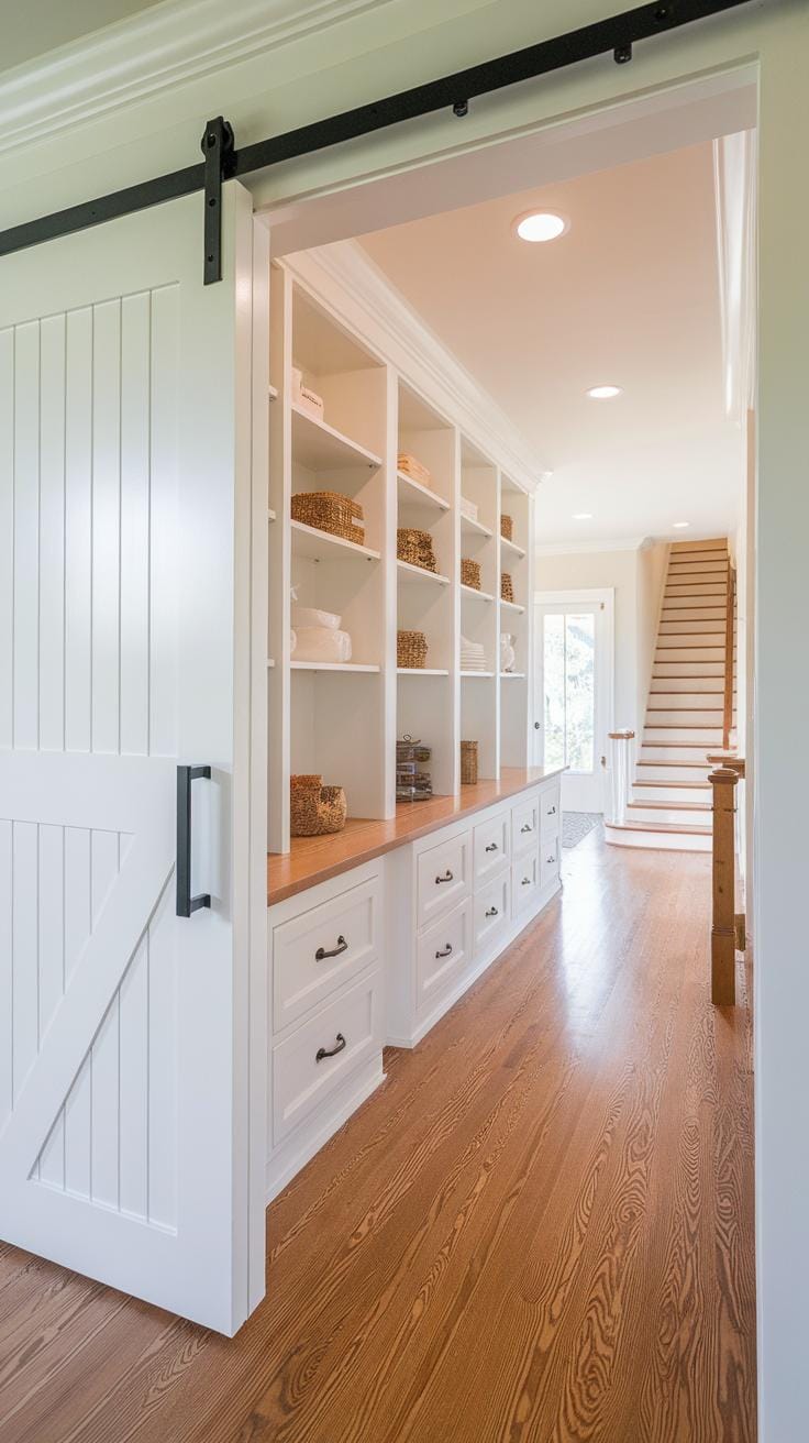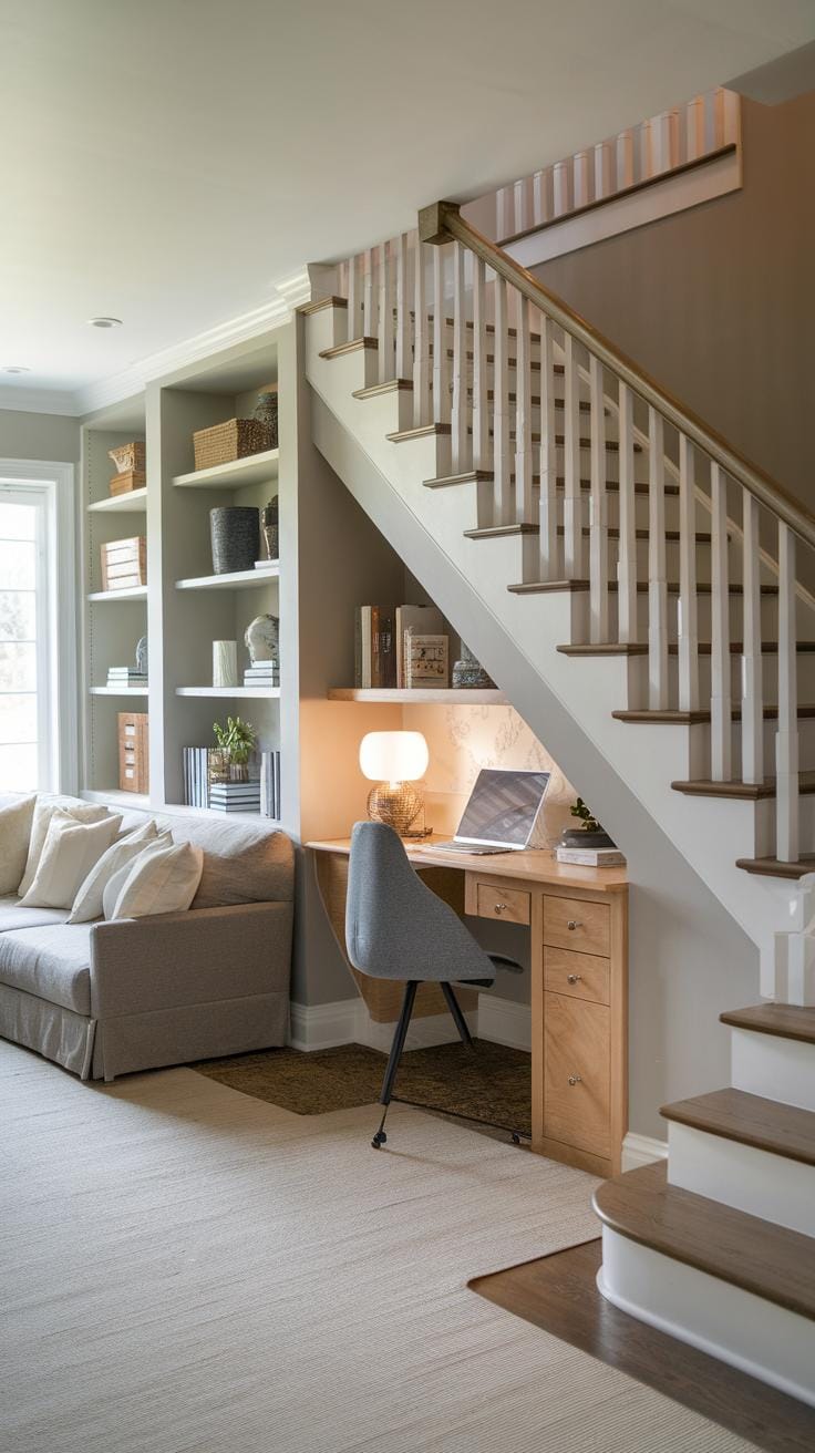 Under-stair storage offers hidden space that often goes unused. You can install pull-out drawers, cabinets, or shelves in this area to hold shoes, cleaning supplies, or seasonal items. This choice turns otherwise wasted space into something very practical.